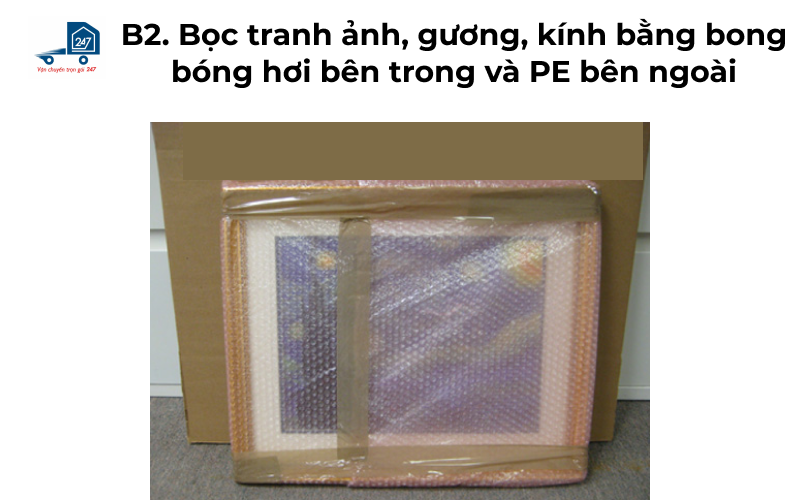 - Bọc tranh ảnh, gương, kính trong một lớp bong bóng hơi và sau đó bọc lại bằng lớp PE phủ ngoài để giữ chặt.