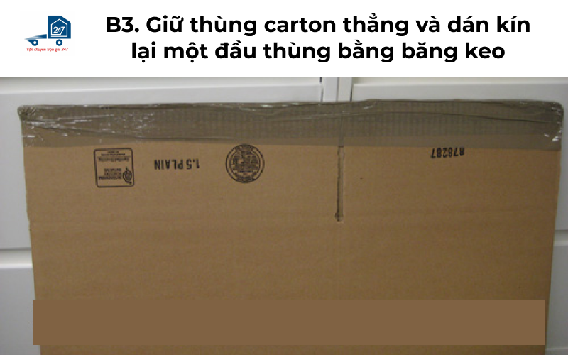 - Giữ thùng carton thẳng và dán kín lại một đầu thùng bằng băng keo để đảm bao nó không bị mở ra khi di chuyển.