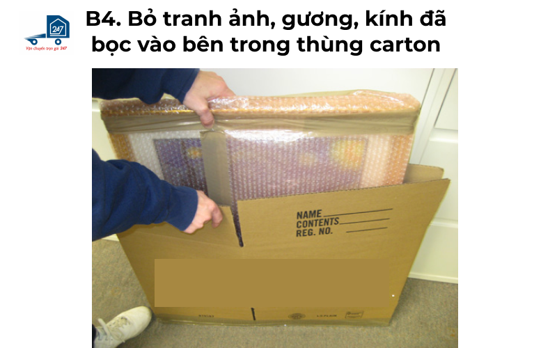 - Bỏ tranh ảnh, gương, kinh đã bọc vào bên trong thùng carton.