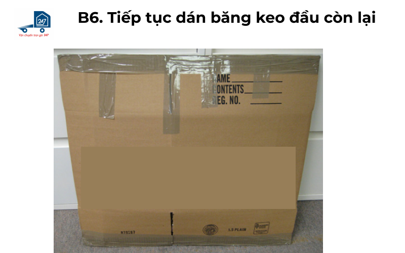 - Tiếp tục dán băng keo đầu còn lại, quấn quanh thùng một lần nữa để đảm bảo chúng không rơi ra ngoài khi vận chuyển.