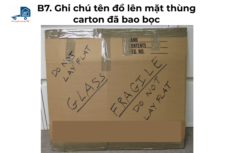 - Cuối cùng hãy ghi chú lên thùng bìa carton đang đã bao bọc. Dùng bút lông viết lên tên của đồ đã bao bọc đóng gói như “kính”, “gương”, “tranh ảnh” và lưu ý “Hàng dễ vỡ – Xin nhẹ tay” để người vận chuyển cẩn thận hơn.